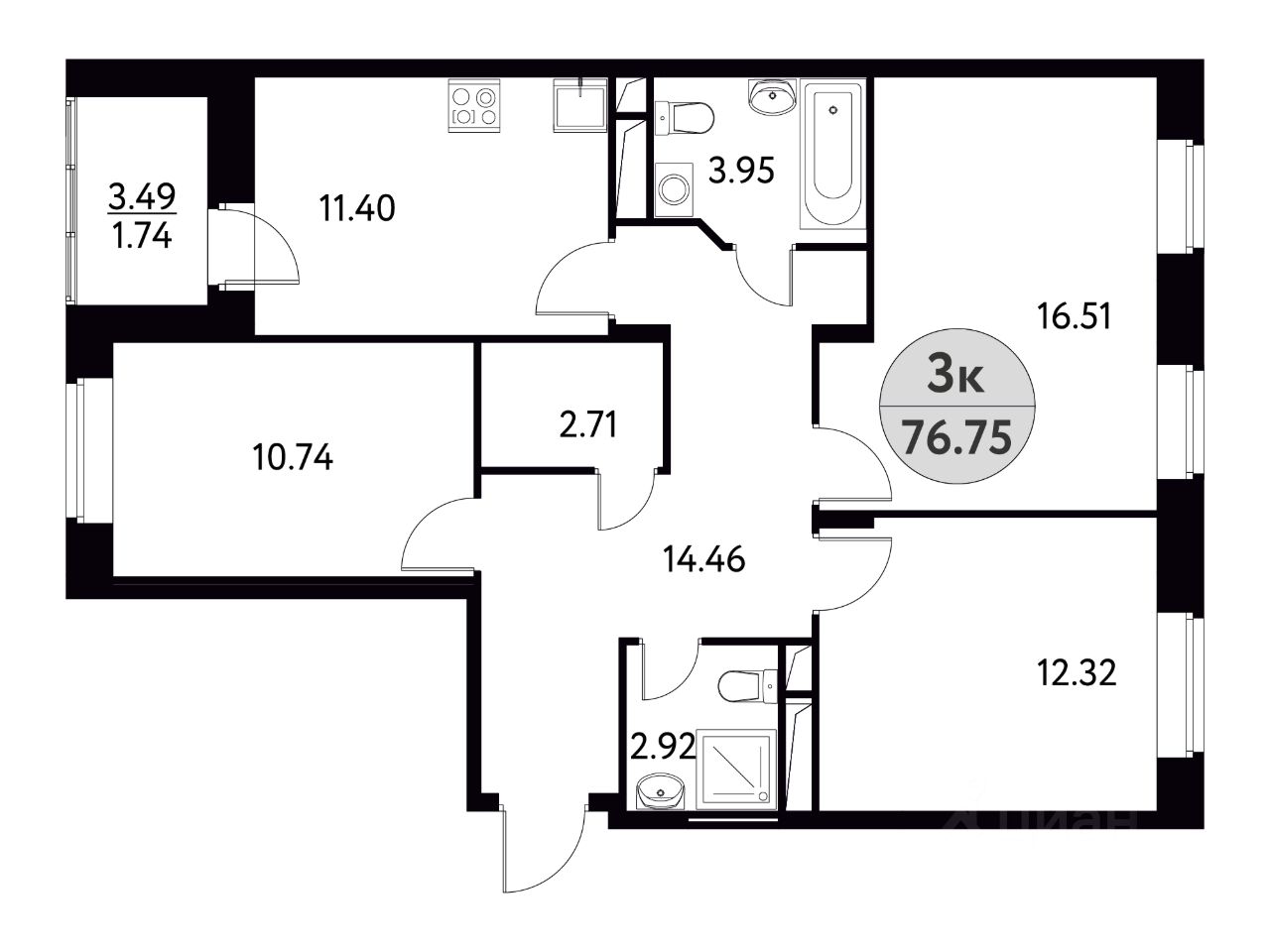 Общая площадь76,75 м2